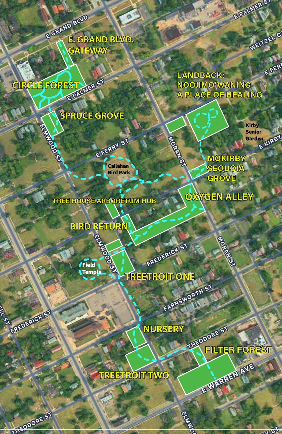 To achieve more connected green space without a large area of land available, while making it more accessible to more neighbors, we are connecting these spaces into a winding park.